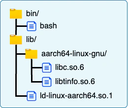 5 /lib/ld-linux-aarch64.so.1 (0x0000ffff7fce9000)The first file can be ignored as it is a virtual dynamic shared object (VDSO). It is not a real file and represents a kernel interface that is automatically provided to the application. The rest of the files are the actual dependencies. Copy those to the rootfs directory. It should look like this: