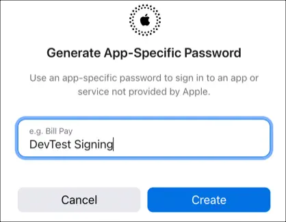 Name the app-specific password so that it’s clear where this is being used and the purpose. For example, “Local Signing” or “CI/CD Signing”. Click Create.