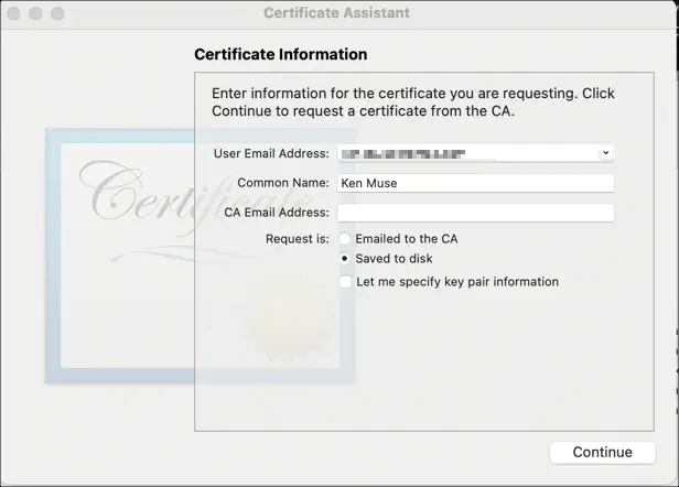 Follow the instructions here to create a certificate signing request and save it on your machine. You will then select and upload the generated file using Choose File. Click Continue