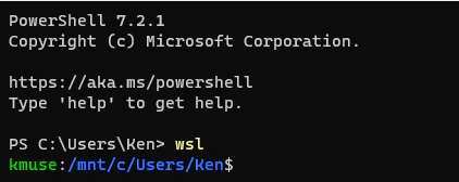 Many developers that are getting started with Windows Subsystem for Linux begin the same way: using the local file system. This means that after typing wsl, they are navigating the Windows folder structure, often starting in /mnt/c/Users. For example, I might be working in C:\Users\Ken and then moving to /mnt/c/Users/Ken in WSL: