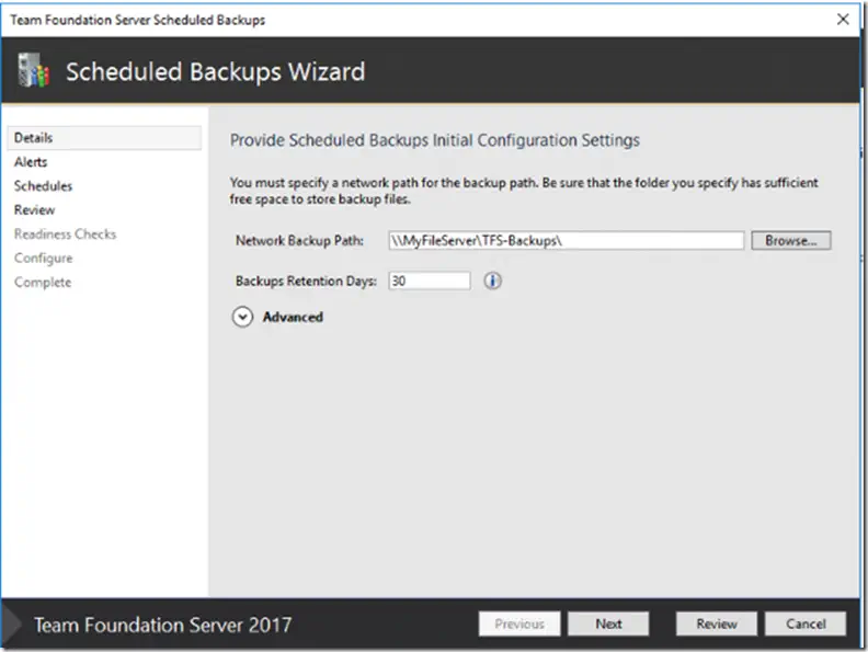 On the first screen, specify a file share where the TFS service can store the backups (Network Backup Path). Next, configure the number of days the backups will be retained (Backup Retention Days). Press Next.