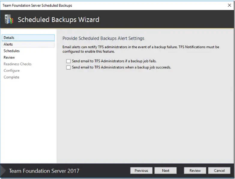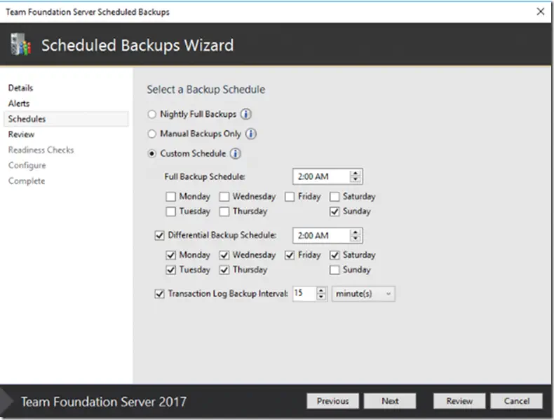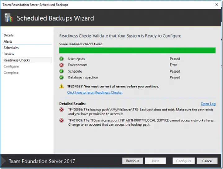 After setting the schedule, you can use the Review and Readiness Checks to ensure the backups have the proper permissions. It will verify that the TFS service account has all the necessary permissions to access the file share and to create database backups. Ensure that you’ve handled all warnings before you leave this screen. Press Next to do a final check and to configure the scheduled task.