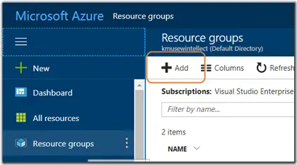 To begin, you’re going to want to create a new resource group (RG). A resource group is a way of grouping together Azure resources that are being used together. When a resource group is deleted, everything in the group is deleted. This makes cleanup fast and easy. Begin by opening the Resource groups blade. Press the Add button to create a new group.