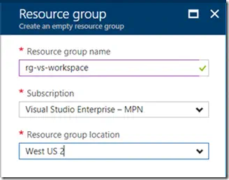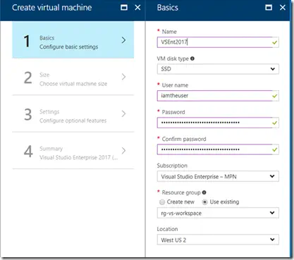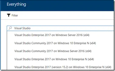 After pressing Add, the marketplace will open. Type Visual Studio. You will see several options available. For this demo, I’m going to select Visual Studio Enterprise 2017 on WIndows Server 2016 (x64). This will bring me to a screen where I can select a specific image. Let’s choose Visual Studio Enterprise 2017 (version 15.2) on Windows Server 2016 (x64). If you don’t have an MSDN account or a VS Enterprise license, make sure to choose the free Community Edition.