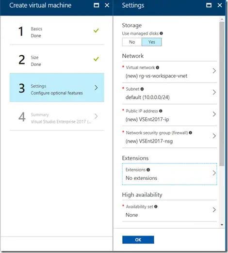You will now be guided through a wizard that will help you create the virtual machine. Most of the options are fairly intuitive. Make sure that the machine is being created within our resource group. I recommend leaving the disk selection as SSD for the best performance when you plan to use applications like Visual Studio that need to use the disks frequently. Once you have filled in the first page, press OK to move to Step 2. Make sure to remember the user name and password you create here. You’ll need those credentials to log in to your virtual machine later.
