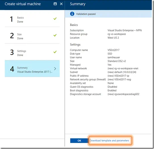 Step 4 is a final validation and gives you the option to download the template and parameters that are being used to create this virtual machine in Azure Resource Manager. This allows you to recreate this environment quite easily from Powershell or the Azure portal without having to go through this wizard a second time. Press OK to build your VM.