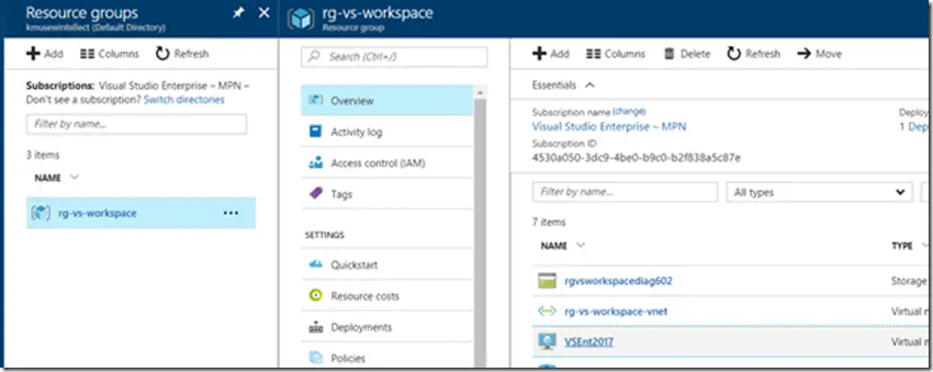 Now that we have a resource group, we need to begin creating our workspace. For this demo, we’re going to create a Visual Studio 2017 Enterprise Edition environment. Click the newly created resource group to open it. Once it’s open, press the Add button to start creating new resources.
