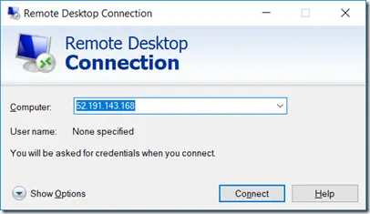 Now, it’s time to connect to our new machine. Open Remote Desktop using either the downloaded RDP or the public IP address and press Connect. Then enter the user name and password you specified when you created the virtual machine to connect to the desktop.