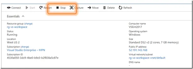 If you visit the pricing guide, the numbers can seem quite high. For example, at the time of this writing a dual-core D2v2 machine is $183/month and a quad-core D3v2 is $365/month. Remember that with Azure, you pay for what you use … and you won’t be using this machine 24×7. Azure billing on virtual machines rounds to the nearest minute, so the pricing can be very effective. Using a D2v2 instance for 4 hours will cost you just under $1 in compute charges. To use the more powerful D3v2 instance, you will pay less than $2. If you make sure to stop the VM when it is not in use, you can minimize the compute charges. And if you delete all of the resources when you are finished with the VM, then you can stop the billing entirely. As you become more experienced with deploying in Azure, you can use the templates you created earlier with Powershell to quickly create an environment, then remove the resource group via Powershell when you are finished. This can make it even easier to just use the resources you need.