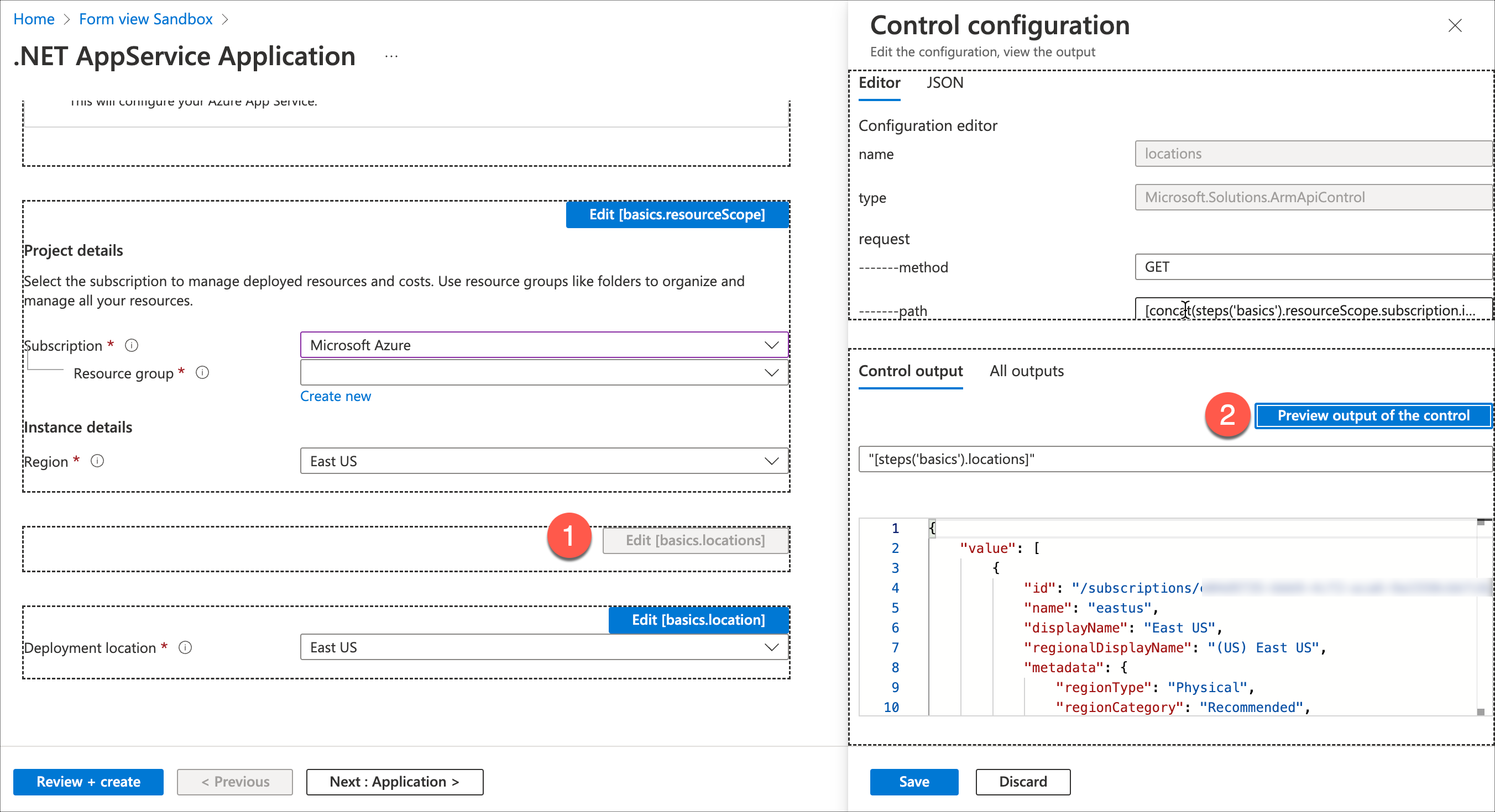The first step is to add the API control. We’ll give this control the name (identifier) locations. The endpoint uses the GET HTTP method. The path should be everything after https://management.azure.com (which makes this agnostic to the particular Azure region). The code will use the concat function to combine the output from the basics step’s resourceScope control to build the URL. The .subscription.id property returns /subscription/{ID}, giving us the key part of the path. The final implementation would be this: