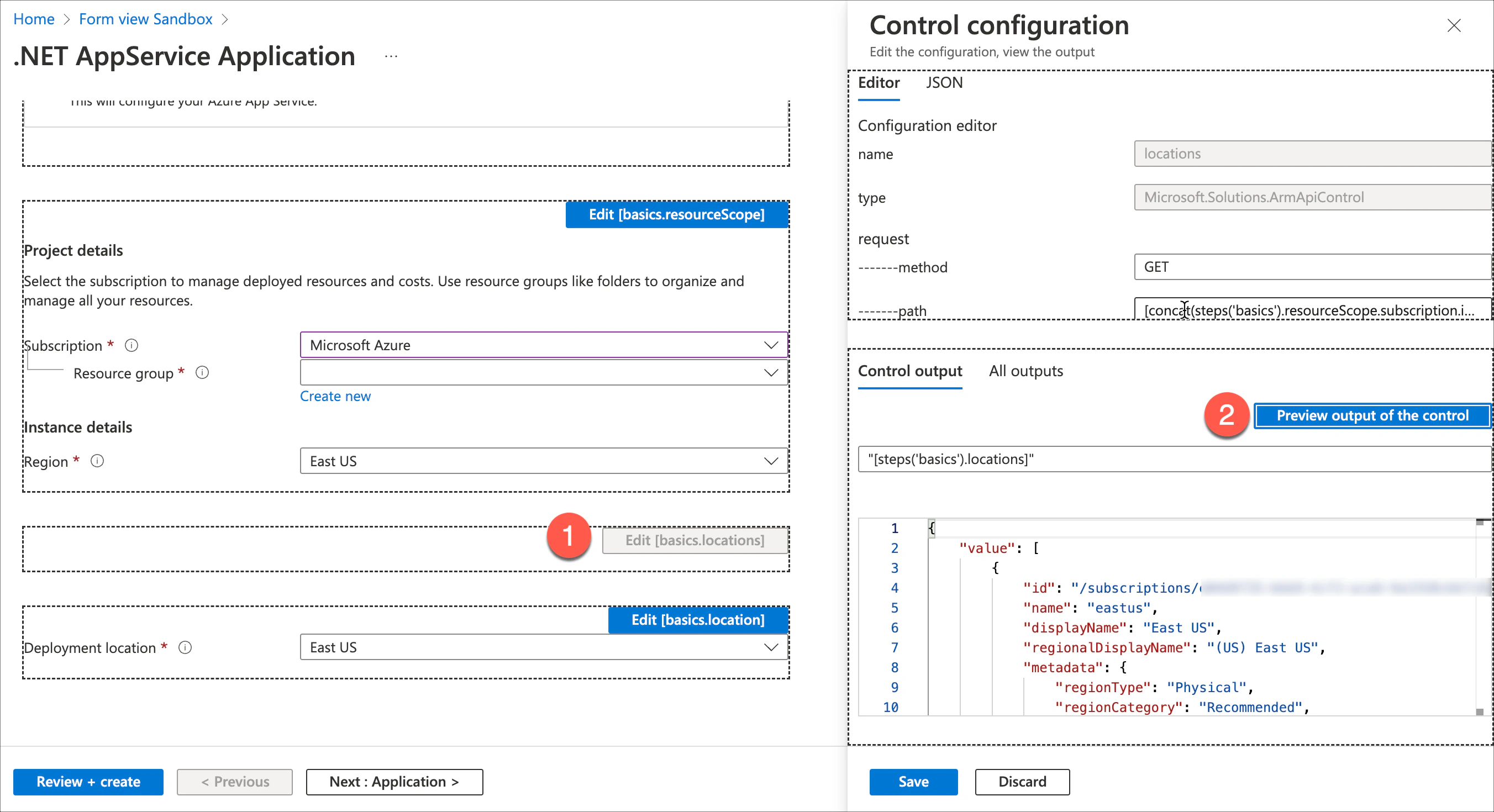 One of my favorite of these controls is Microsoft.Solutions.ArmApiControl. This control is hidden, displaying nothing that would indicate it is present. It exists to make calls to the ARM management endpoint, https://management.azure.com. This control executes a query and returns the results as a JSON object. This object can then be used to populate other controls. Getting the most out of this sometimes means using the debug view (control editing) to see what a given control is generating as an output. That can then be used to customize the endpoint called by the control using some of the built-in functions. Most ARM calls return a value object that contains the results.