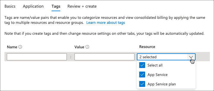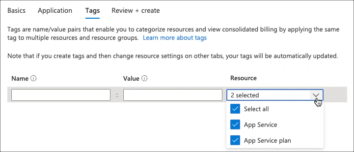 2param tagsByResource object = {}Then, for each taggable resource, a function to extract the tags. For example, for an App Service Plan: