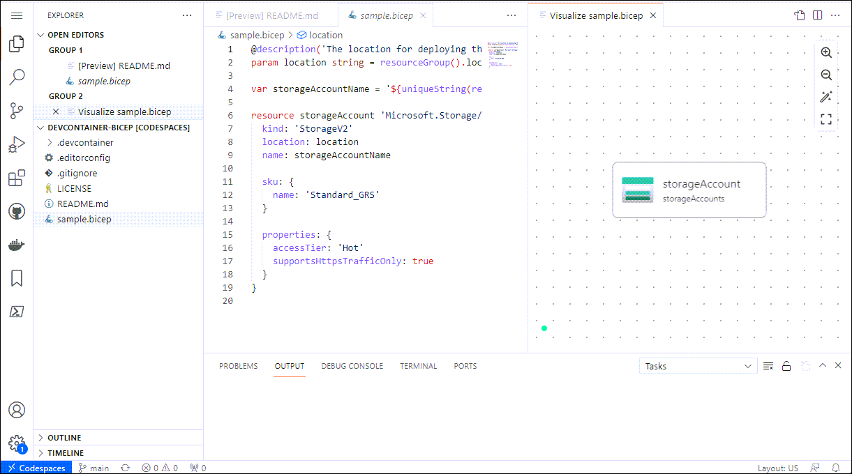 That’s it. A single folder and those two files creates a complete, working Bicep development environment that runs in VS Code or in GitHub Codespaces. This environment can be utilized by everyone working in the project, ensuring that each person has the same experience and all necessary tools. In this case, it also eliminates the complexity of setting up Bicep or creating an environment which can be used for deploying Azure rsources.