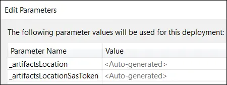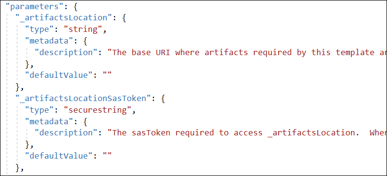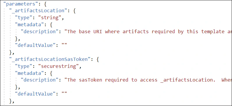 The first value, _artifactsLocation, represents the base URL for a path where the documents will be staged. This path must be a publicly accessible URL. The _artifactsLocationSasToken is a query string appended to the URI which typically contains a generated