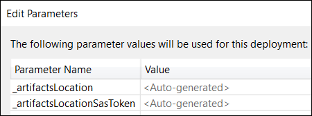 So, how do these values get populated? If you attempt to deploy the templates using Visual Studio, those values will show as auto-generated: