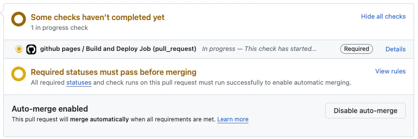 Because Pages now uses Actions (and a build artifact), it’s easier than ever to publish the site. After I merge the code, the checks are re-run, the site is packaged and uploaded, and Pages deploys it. Everything is updated within a few minutes. Every evening, a new build is created and published. This allows me to schedule posts – sometimes weeks in advance. I’m constantly creating new content. When I’m satisfied that everything is ready to go, I have a task that updates the draft status and ensures the publish date is correctly set.