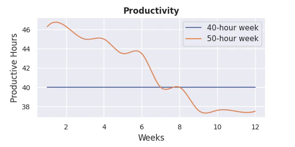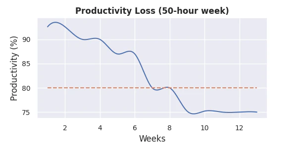 More telling, the percentage of hours where the 50-hour team was productive shows a characteristic decline from fatigue, dropping by 25% around week 8. It’s worth observing that 80% productivity equates to 40 productive hours.