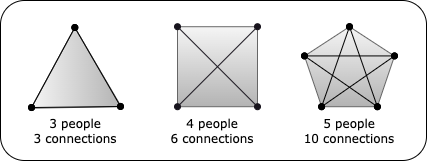When you have two or more people, the number of lines of communication increases. With 3 people there are three connections. With four people, there are six connections. Five people have 10 connections. A simple network map makes this easier to visualize.