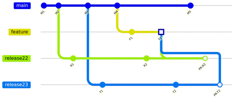 Repeat this process for release23, creating a branch specifically for the merge. The results of the Checks are now separate for both of the PRs. Notice that instead of F2 being the commit for each merge, we are instead merging FT2 and FR2. Because these are different commits (and different SHAs), we see the expected behavior. As the PRs are completed, its feature-merge branch can be deleted. When all of the feature-merge branches have been removed, the original feature branch can be deleted.