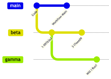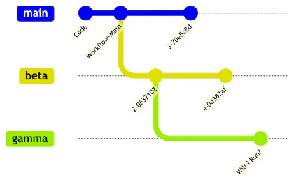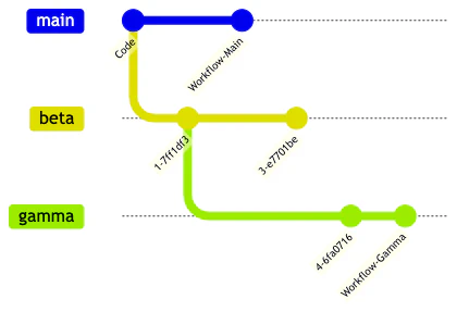 In this case, creating the branches after the workflow file gives us the desired result. The workflow file now exists on beta and gamma, so the version on gamma will run as expected.