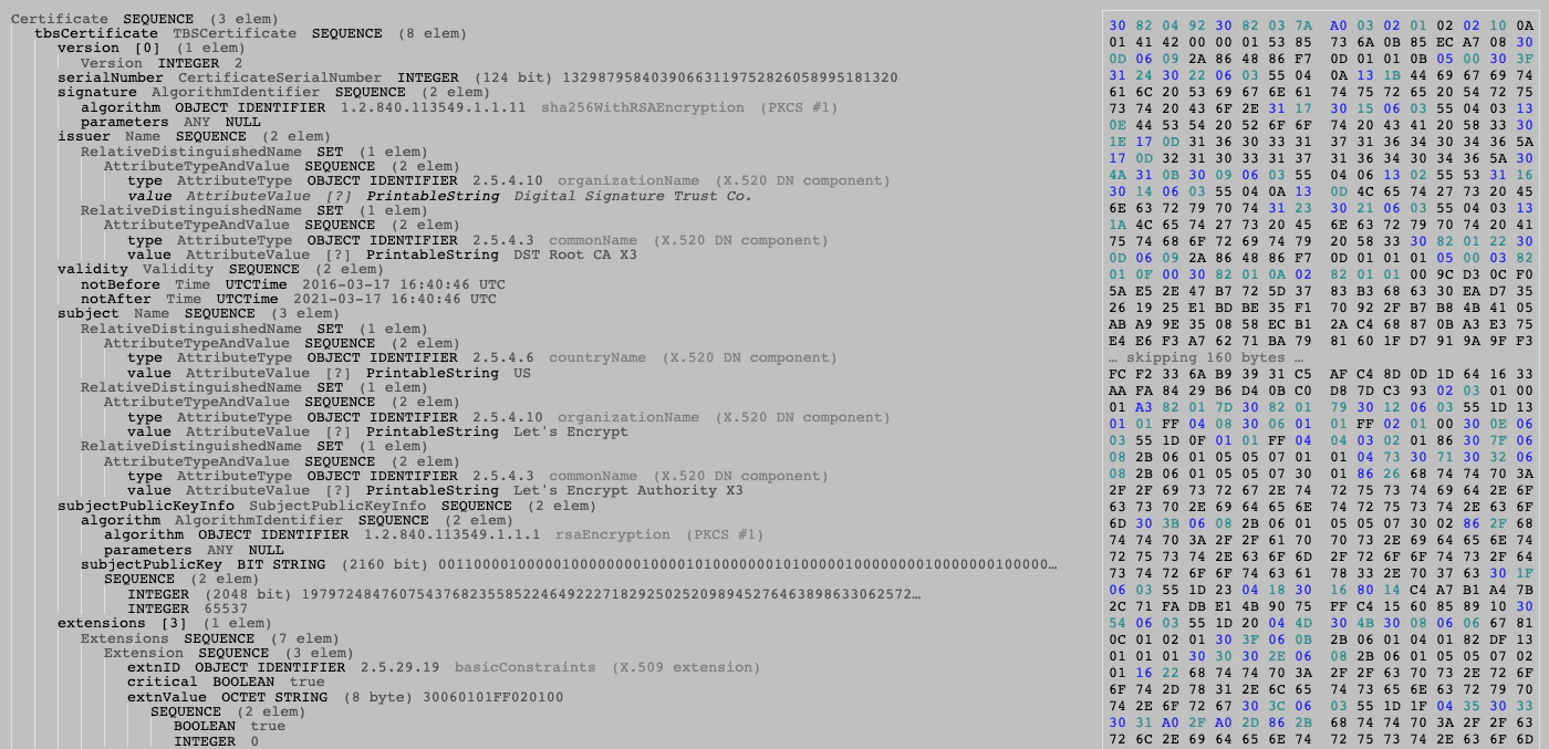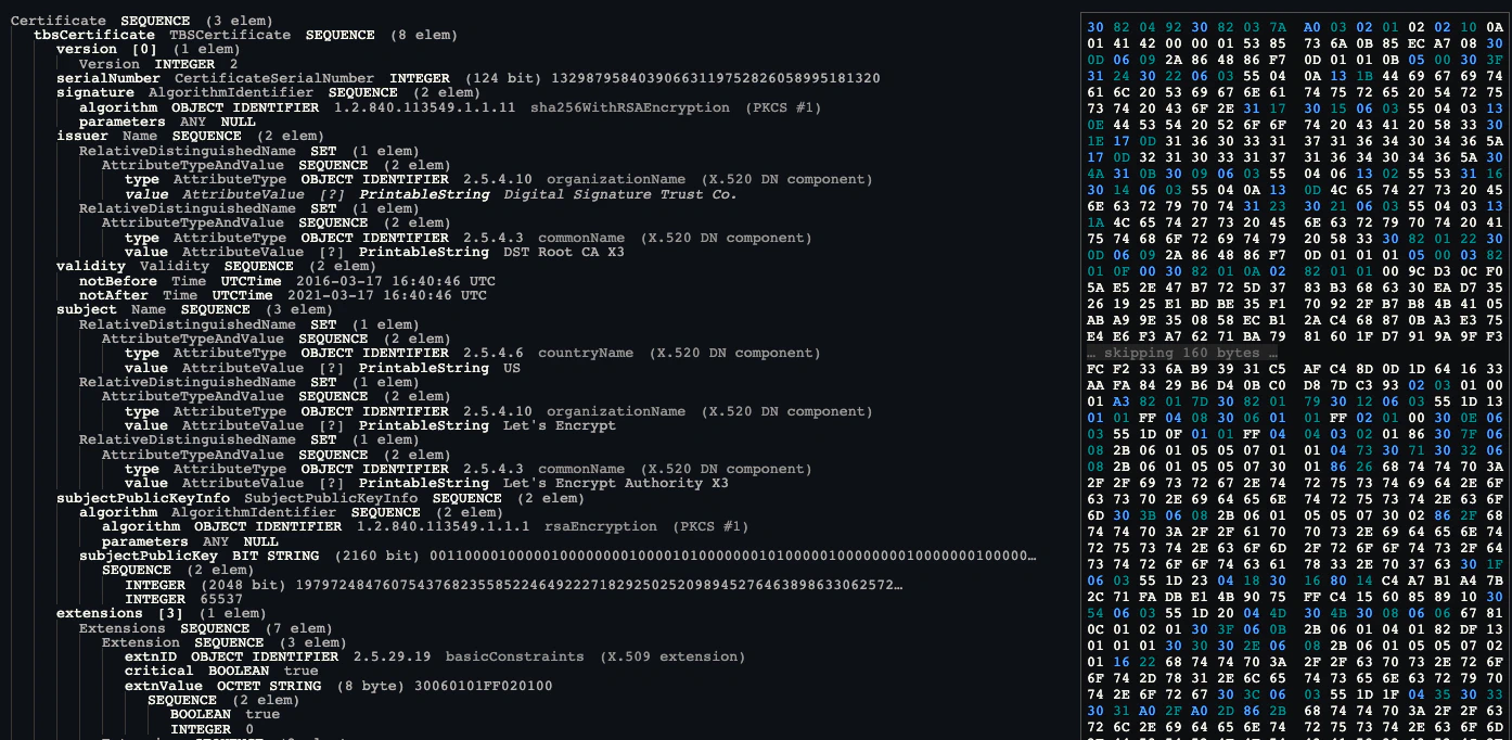 Both certificate data and the private key rely on the ASN.1 standard (Abstract Syntax Notation One) to encode their data, storing it in a binary format called DER (distinguished encoding rules). Basically, this is just a standardized way of serializing the fields. Each field is encoded as a tuple consisting of a Type (tag number), the length of the data, and the data value. To make this easier to understand, let’s show a few examples. There are quite a few more types that can be encoded, but this will provide you with the basics.