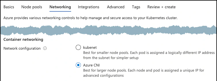 The cluster uses Azure CNI networking. This is required to support Windows nodes. In the portal, the network configuration is available under the Networking tab. When using the CLI, you’ll need to specify